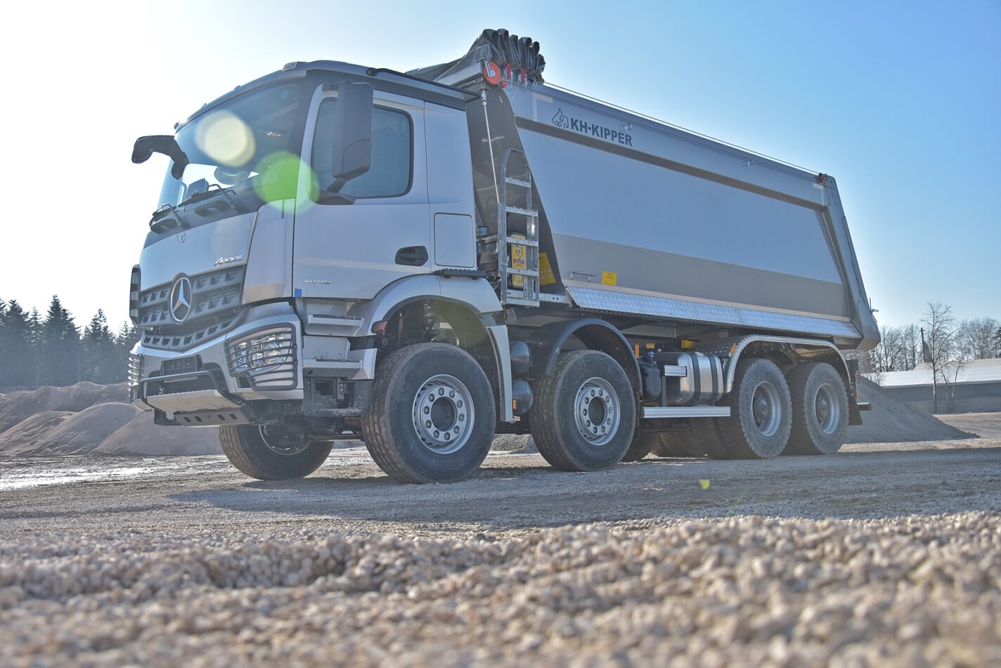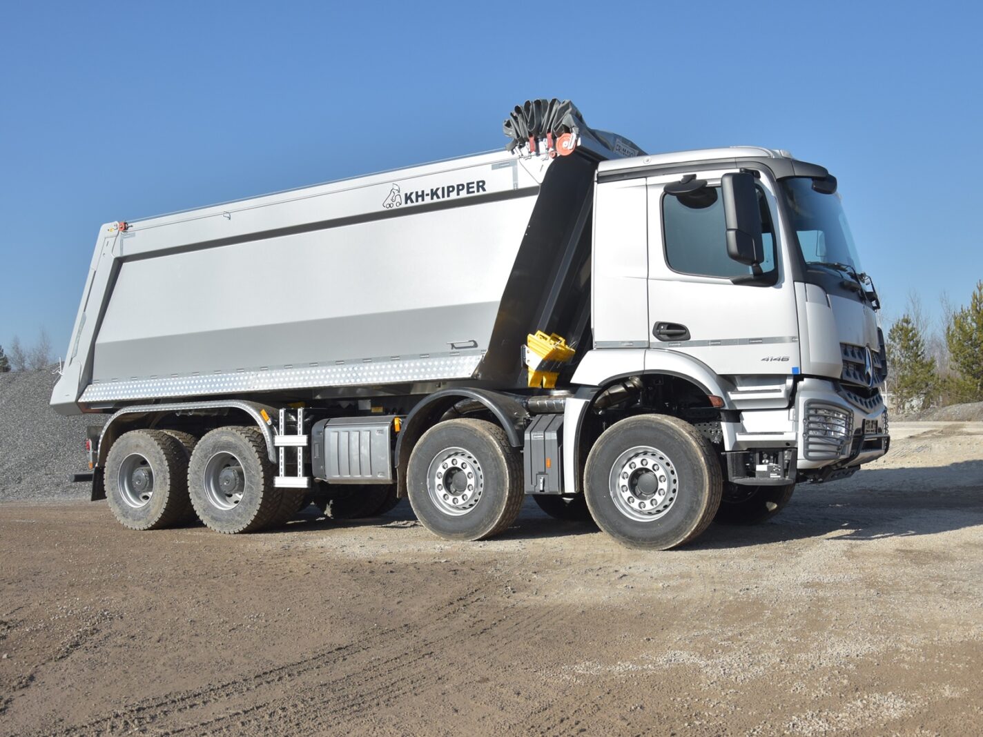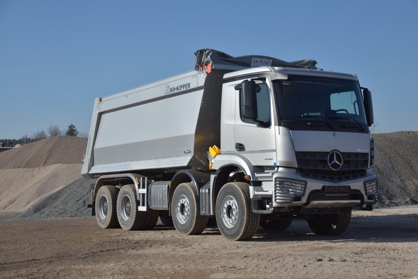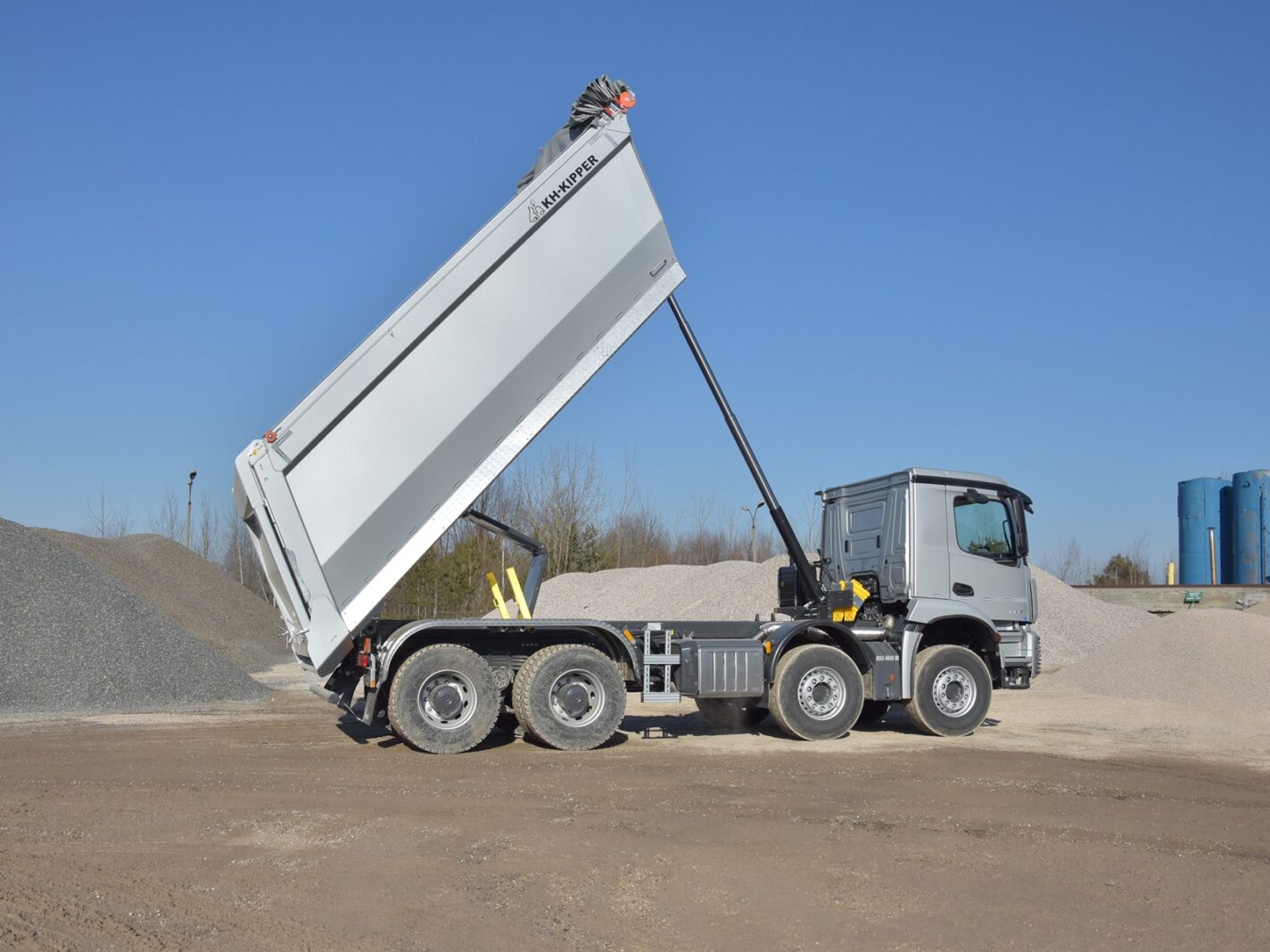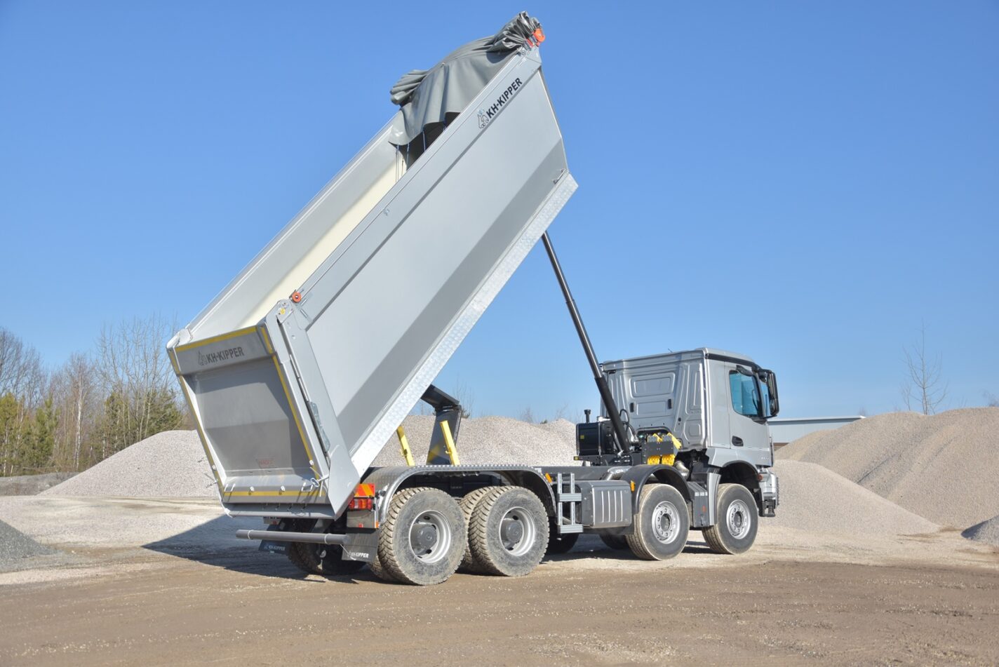 Zabudowa W1CE o objętości 24 m3 to klasyczna skrzynia o prostokątnym przekroju z wysokowytrzymałej stali HARDOX 450. Charakterystyczne pochylenie przedniej burty, po której materiał lekko się ześlizguje, minimalizuje przyleganie lepkiego materiału przy wyładunku. Odpowiednio wyprofilowane naroża zapobiegają przyklejaniu się ładunku. Gumowa uszczelka i specjalne śruby dociskające burtę tylną zapobiegają wyciekaniu mokrego ładunku i brudzeniu nawierzchni drogowej minimalizując ryzyko ewentualnych kar. Zapobieganie zanieczyszczaniu dróg publicznych ma szczególne znaczenie, jeśli pojazd porusza się w obszarze miejskim. Przy tak wysokich burtach, firma EURO – TRANS zdecydowała się na wygodny, zwijany ręcznie z poziomu ziemi system plandekowy Cramaro.