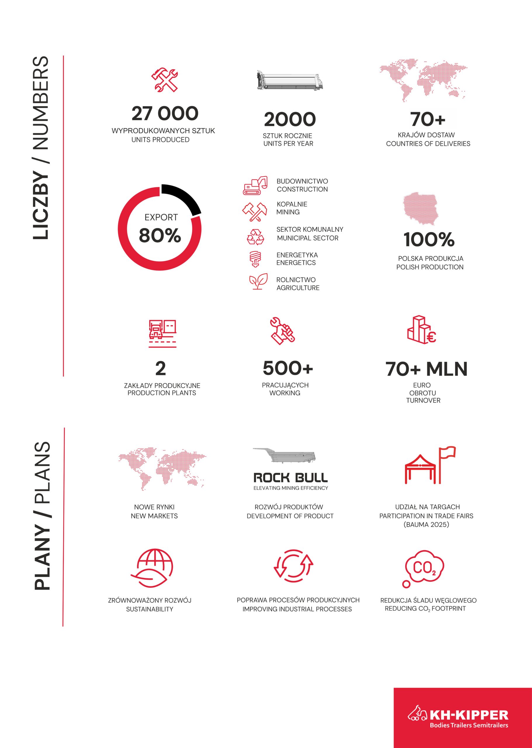 Przyszłość KH-KIPPER będzie wyznaczało poszukiwanie nowych rynków i podążanie za intensywnym rozwojem branży. Mają w tym pomóc m.in. inwestycje w infrastrukturę. W 2024 roku rozpoczęto budowę nowej hali ze stanowiskiem do zrobotyzowanego spawania skrzyń, która usprawni ten proces. Zakupiono też nowoczesny sprzęt do efektywnej obróbki blach. W planach firmy na 2025 jest też m.in. regał automatyczny do lasera 3D. Skutecznie rozwój firmy na zagranicznych rynkach wspiera także międzynarodowa promocja. Dlatego już dziś zapraszamy na stoisko KH-KIPPER na monachijskich Targach Bauma 2025.