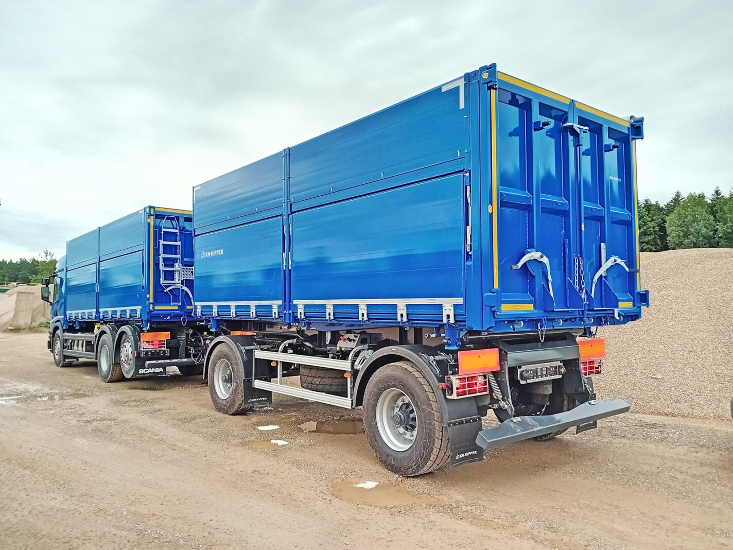 Tylna klapa z górnymi zawiasami otwiera się automatycznie przy podniesieniu skrzyni do tyłu. Dwa szybry umożliwiają precyzyjny wyładunek ziarna, np. do zbiornika. Jeśli zestaw w danym momencie nie przewozi ziarna, z powodzeniem możemy go wykorzystać również do transportu innych ładunków. Otwierana na boki tylna klapa pozwala na załadowanie do skrzyni palet lub długich elementów. Dzięki odpowiedniej szerokości wewnętrznej skrzyń możliwe jest załadownie dwóch palet obok siebie. Drzwi tylnej klapy można przypiąć łańcuchami znajdującymi się po obu stronach skrzyni, co zapobiega ich samowolnemu zamykaniu podczas załadunku.