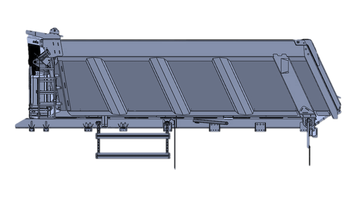 The large body capacity and reinforced side profiles and rear wall ensure maximum efficiency and structural strength. The sloping front wall facilitates material unloading. The rear wall with top hinges opens automatically during unloading. A roof extending the front wall protects the cab and hydraulic cylinder from damage during loading.