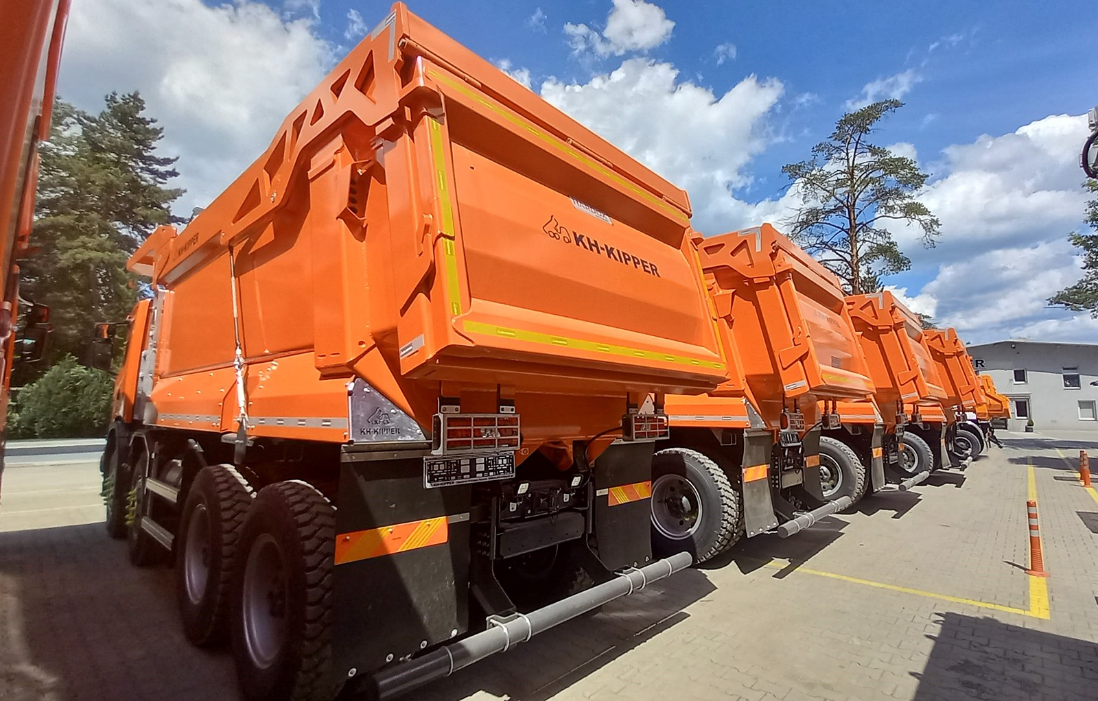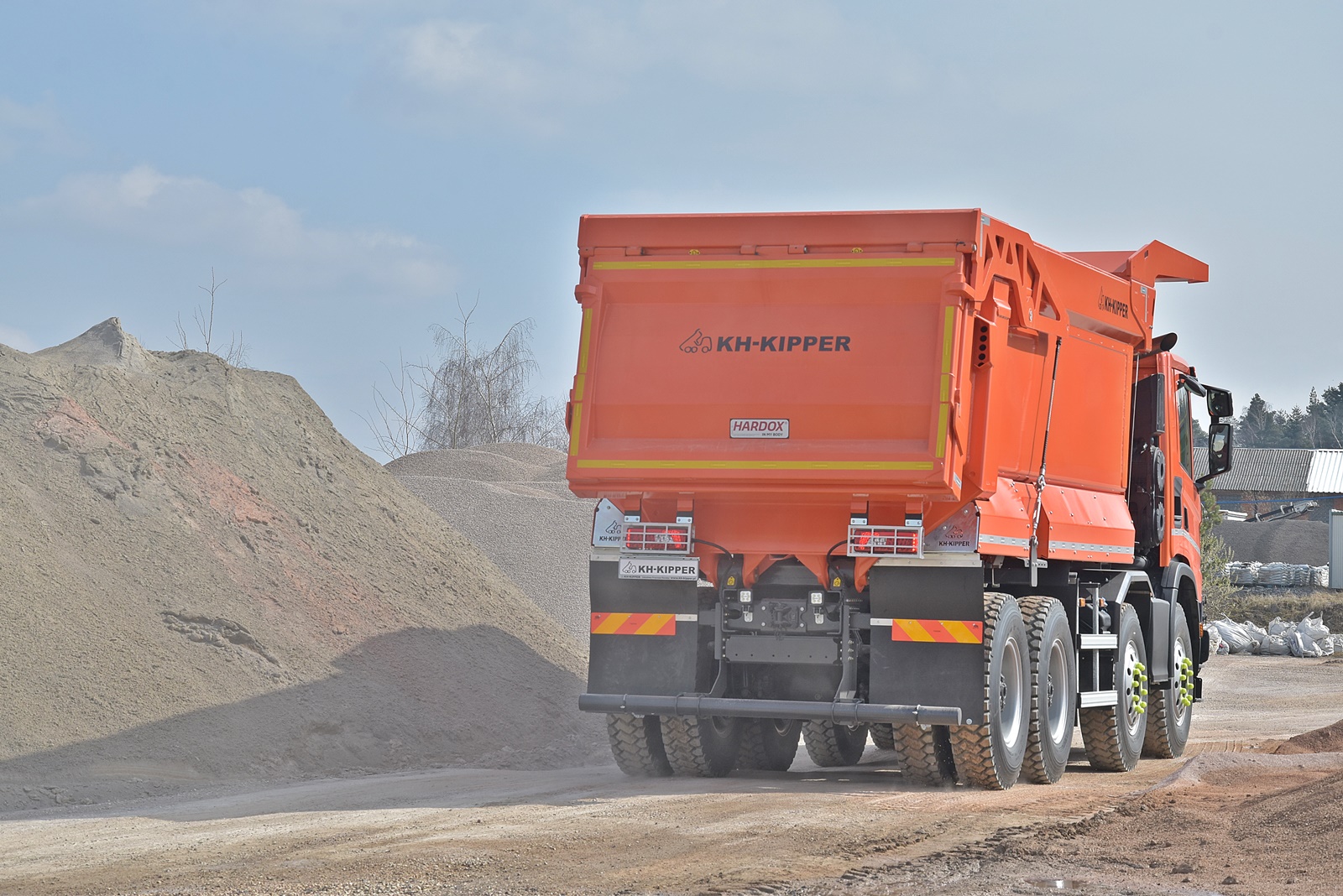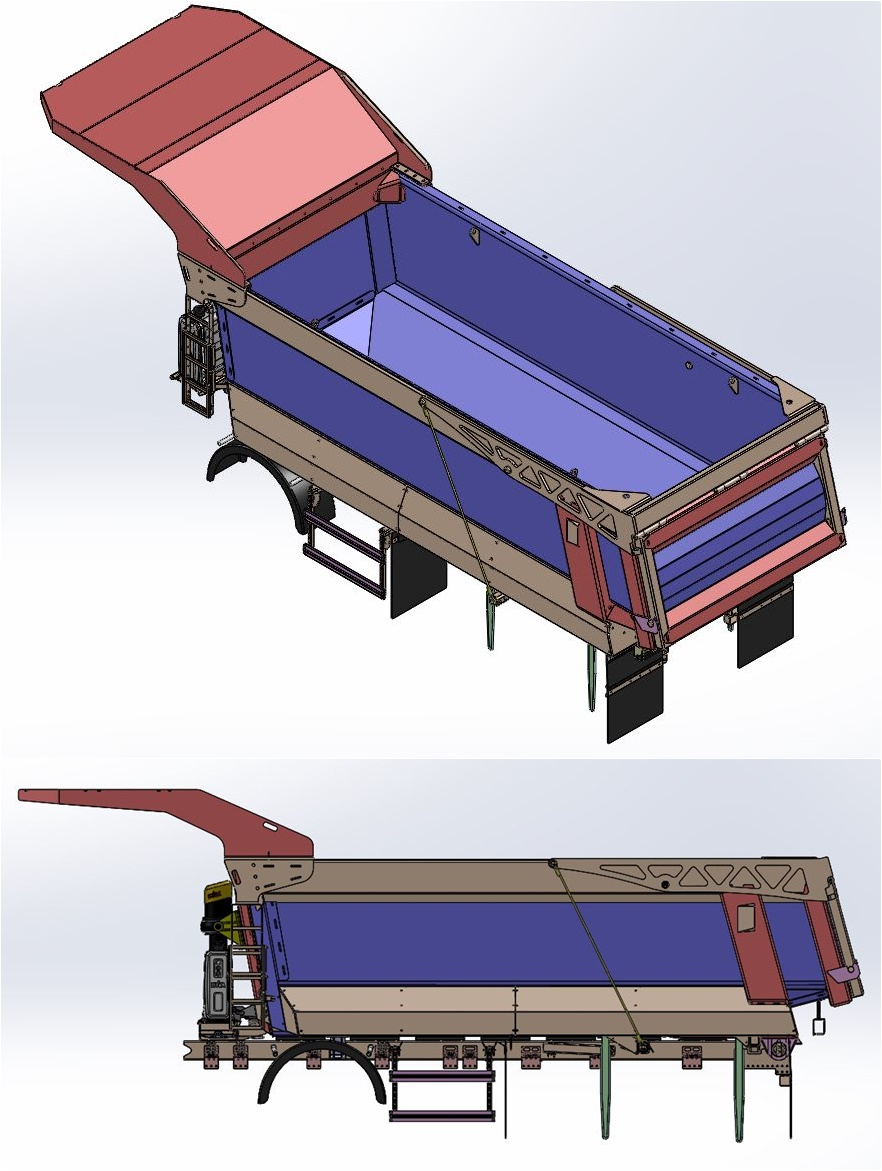 The W1MV features a semi-octagonal design and a sloped front wall, which prevents material from accumulating in the corners of the body. The floor is made of a single layer of 10-15 mm thick HARDOX wear-resistant steel, eliminating the need for additional reinforcements and increasing the resilience and durability of the structure. The side walls are reinforced only by the top profile, rear band, and front wall, ensuring adequate strength while reducing the body’s weight.