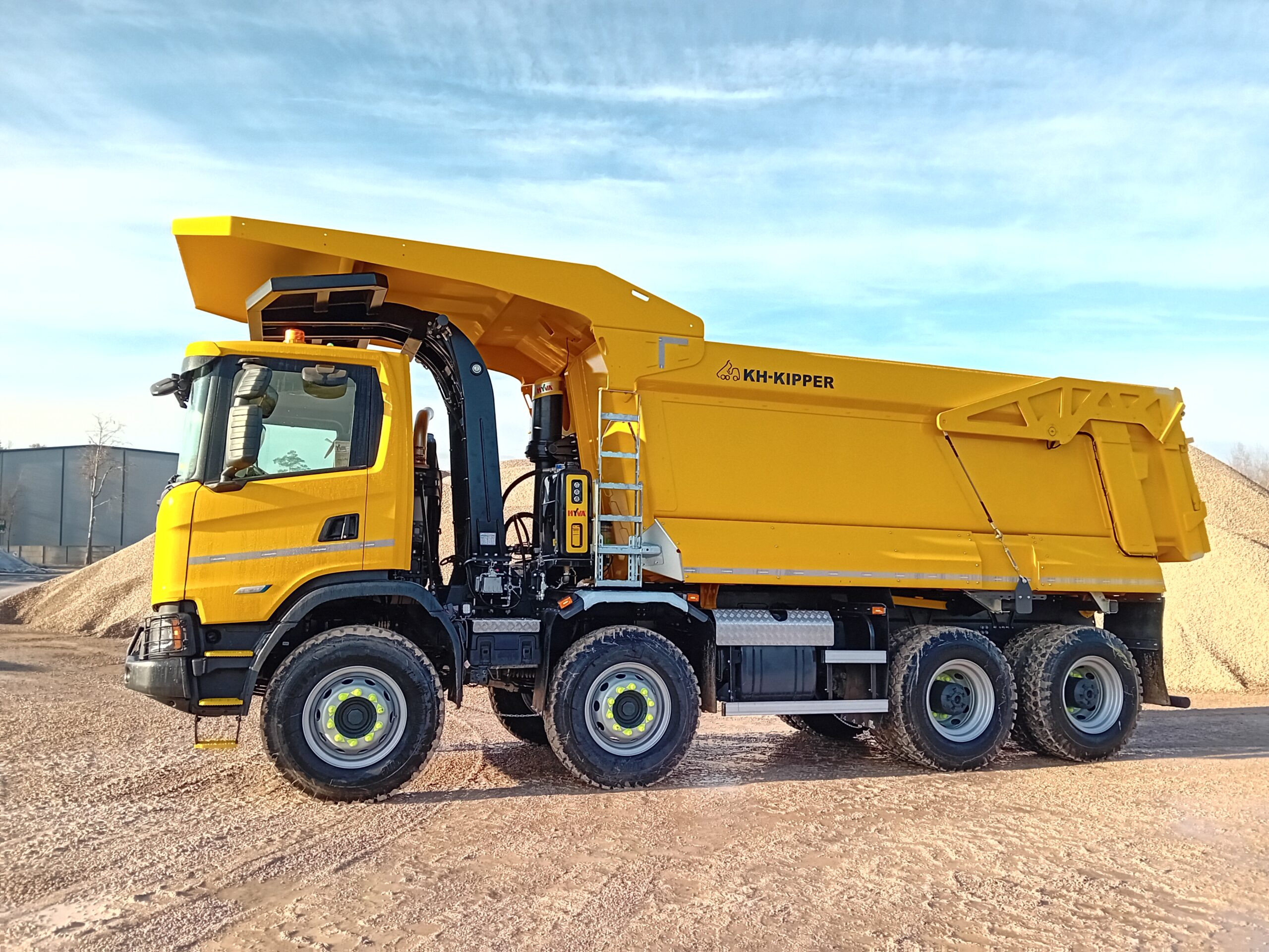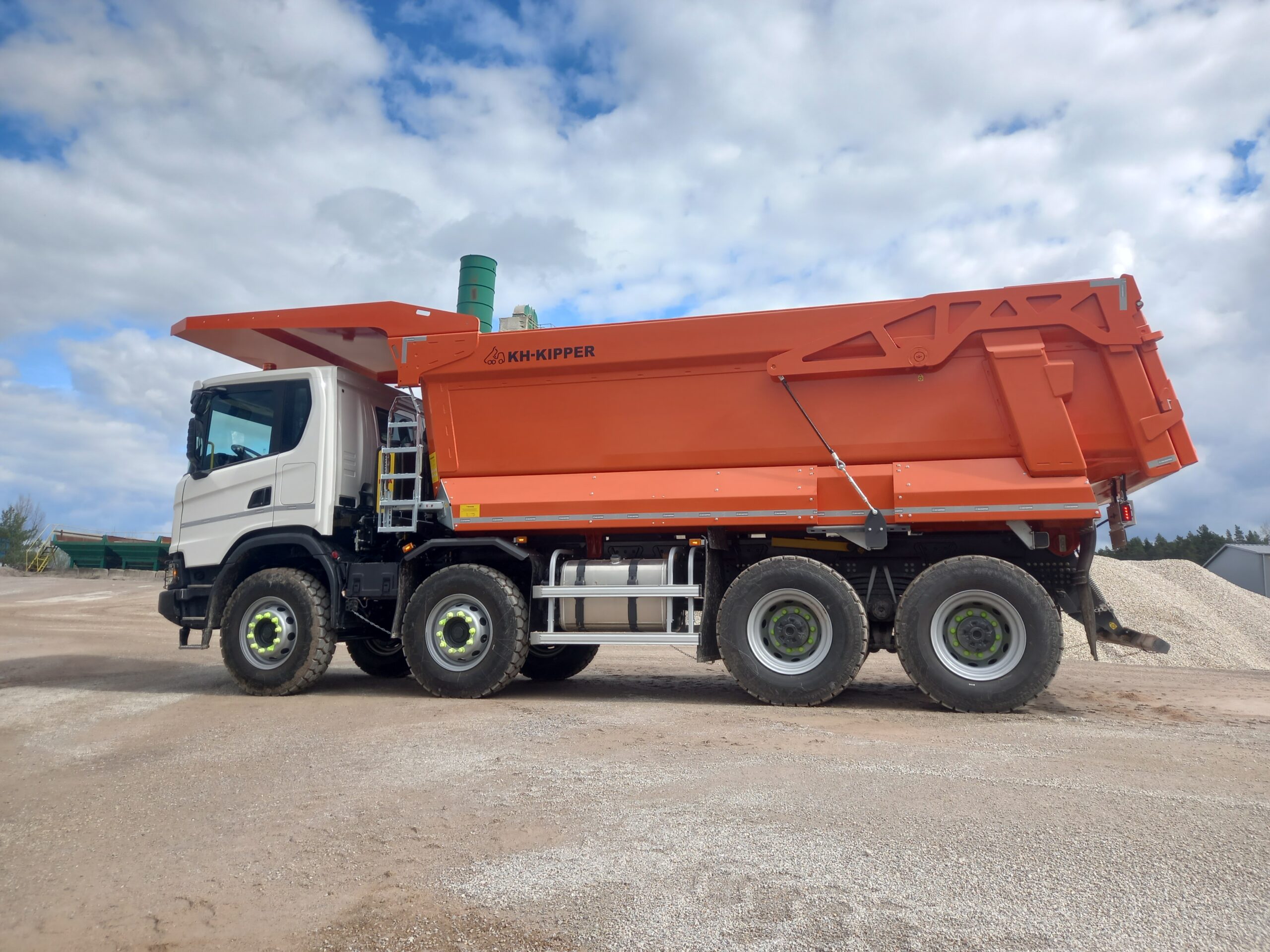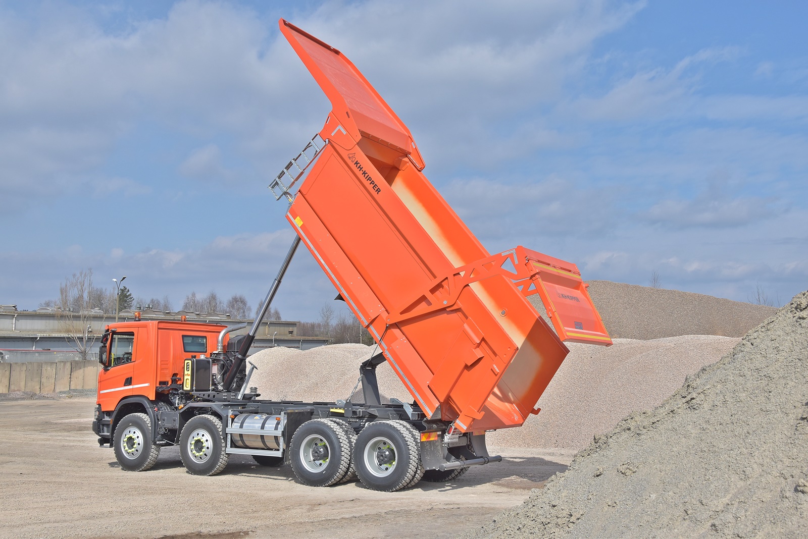 The W1MV features a semi-octagonal design and a sloped front wall, which prevents material from accumulating in the corners of the body. The floor is made of a single layer of 10-15 mm thick HARDOX wear-resistant steel, eliminating the need for additional reinforcements and increasing the resilience and durability of the structure. The side walls are reinforced only by the top profile, rear band, and front wall, ensuring adequate strength while reducing the body’s weight.