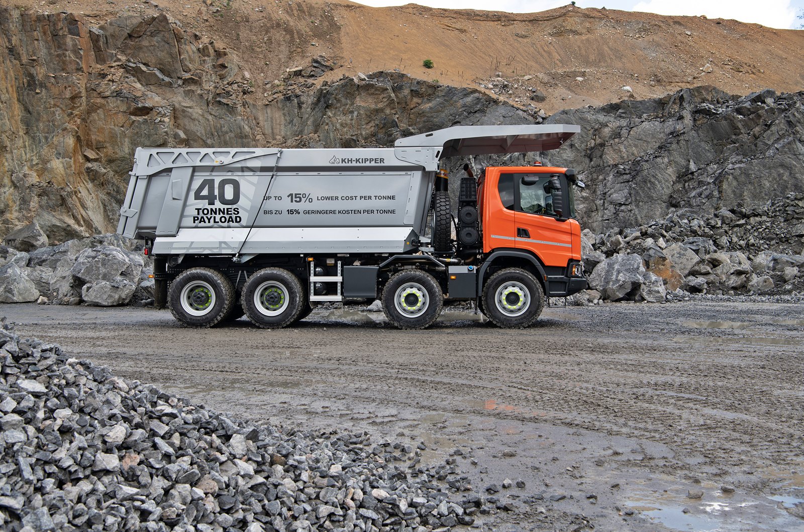 The sloped front wall and raised rear section of the floor prevent material from falling out when driving on slopes.