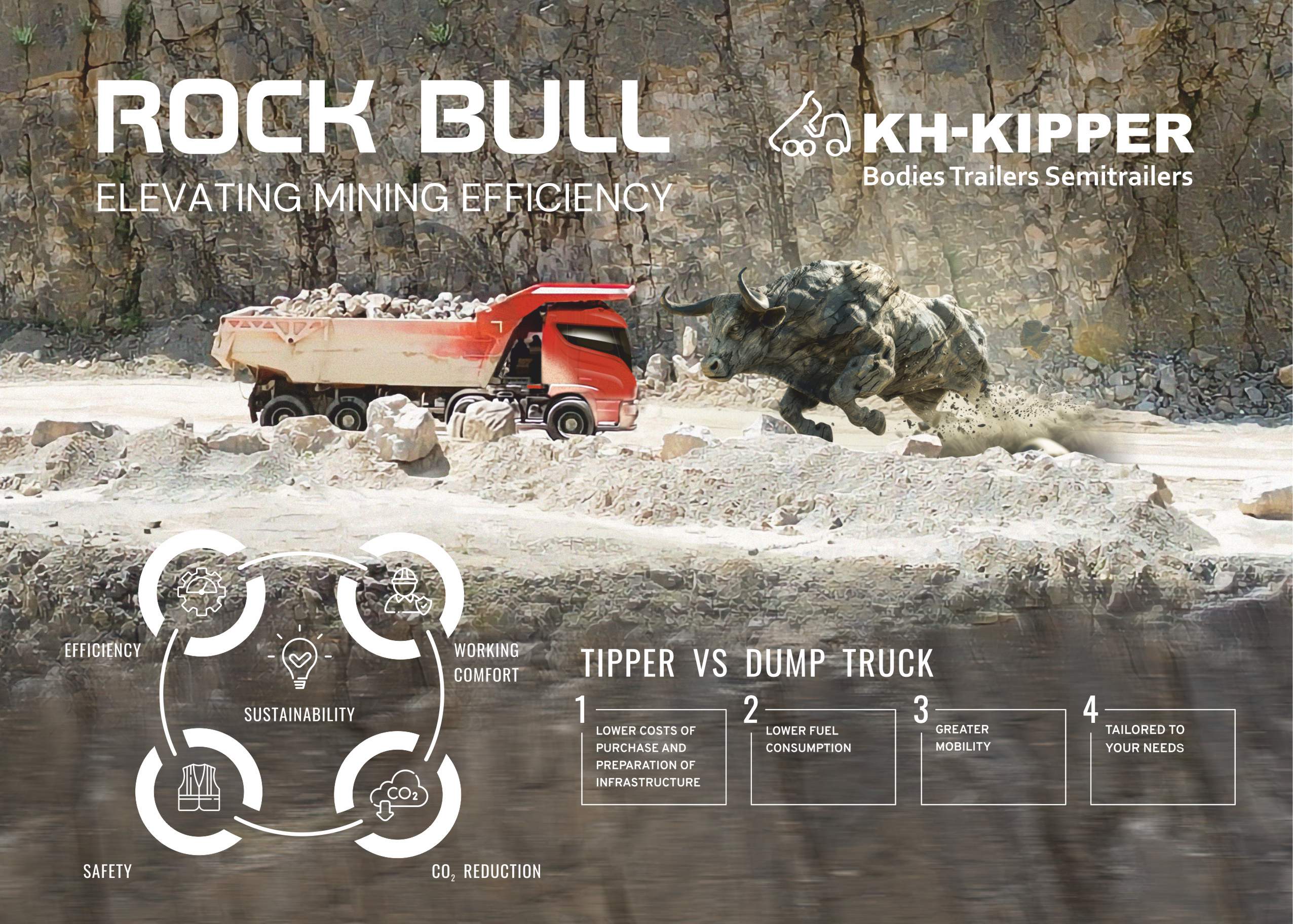 The W1RB Rock Bull is a new tipper body for mining material transport. This high-performance equipment allows for efficient loading with a bucket of any volume, safe unloading in difficult and muddy terrain, and effortless maneuvering in confined spaces, including tight bends on service roads.