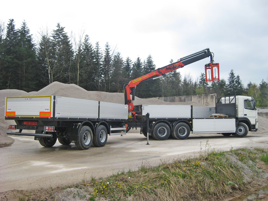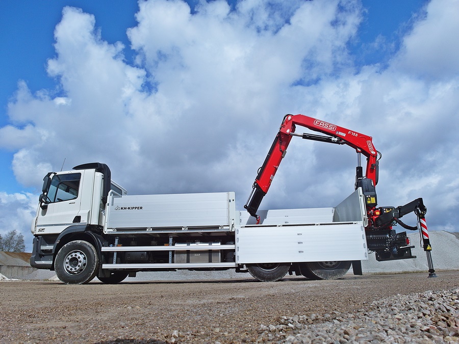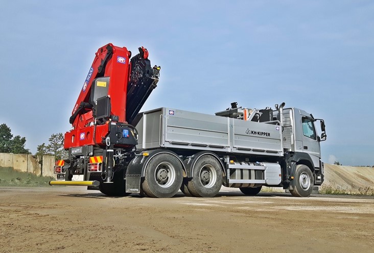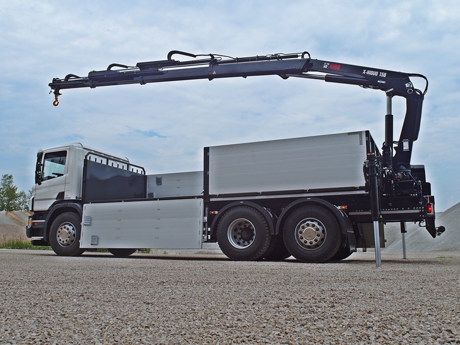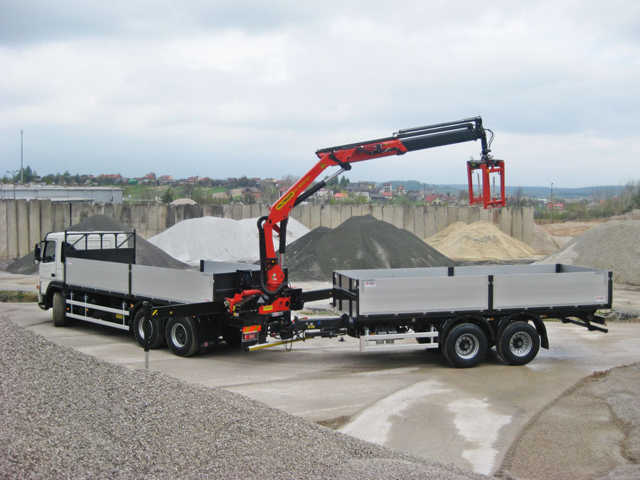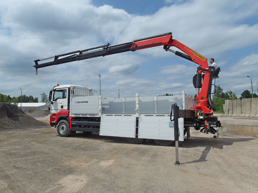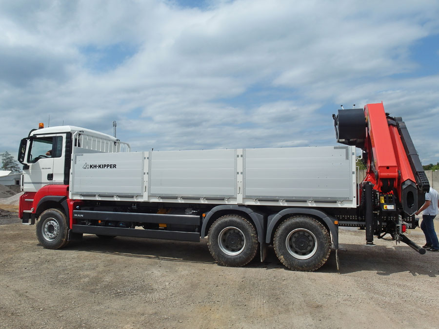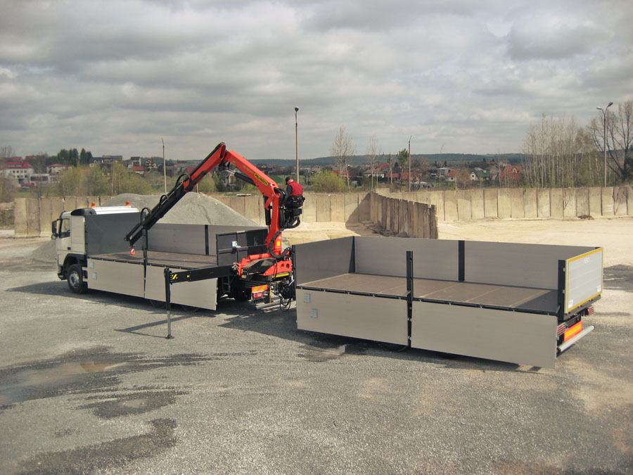 The body is designed for the transport of construction materials on pallets. An integral part of the vehicle’s equipment is a hydraulic crane used for unloading of e.g. paving stone on pallets. The side walls open downwards allowing to unload the body with a fork-lift truck.