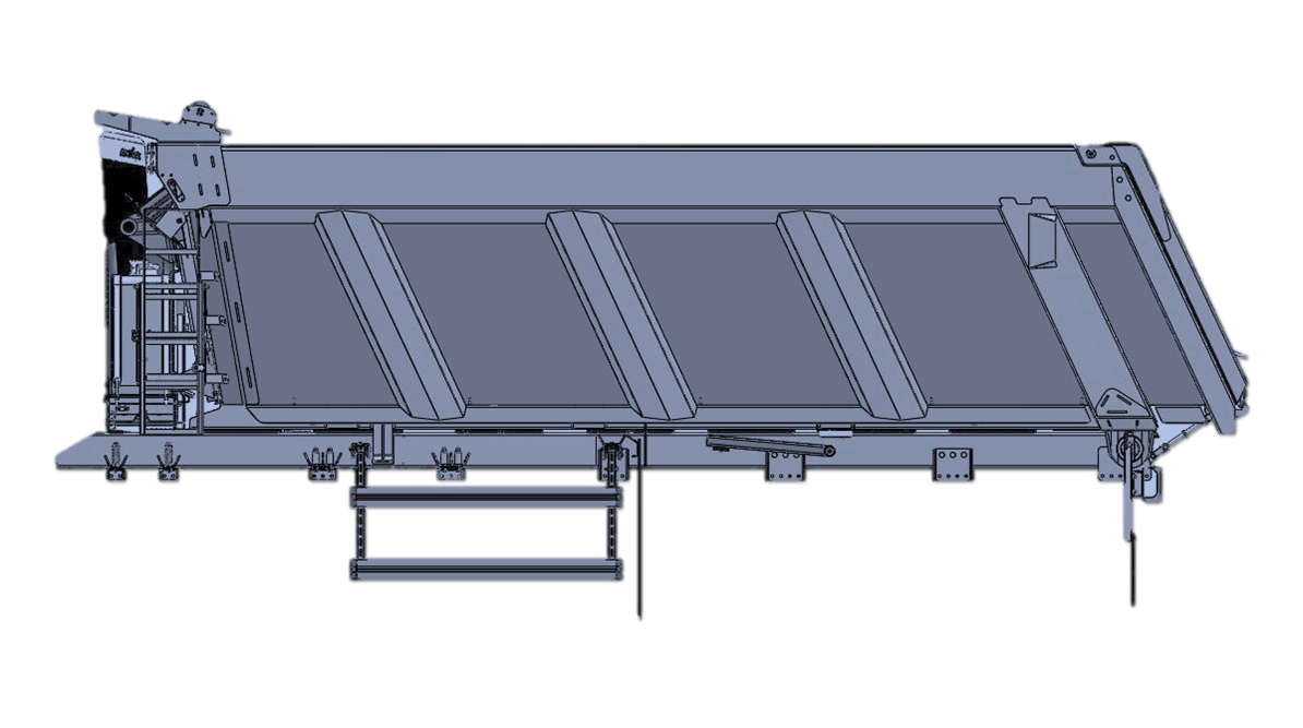 Duża pojemność skrzyni oraz wzmocnione profile boczne i tylna burta zapewniają maksymalną efektywność i wytrzymałość konstrukcji. Pochylona przednia ściana ułatwia wysypywanie materiałów. Tylna burta z górnymi zawiasami otwiera się automatycznie podczas wyładunku. Dach stanowiący przedłużenie burty przedniej chroni przed uszkodzeniami podczas załadunku kabinę i siłownik hydrauliczny.