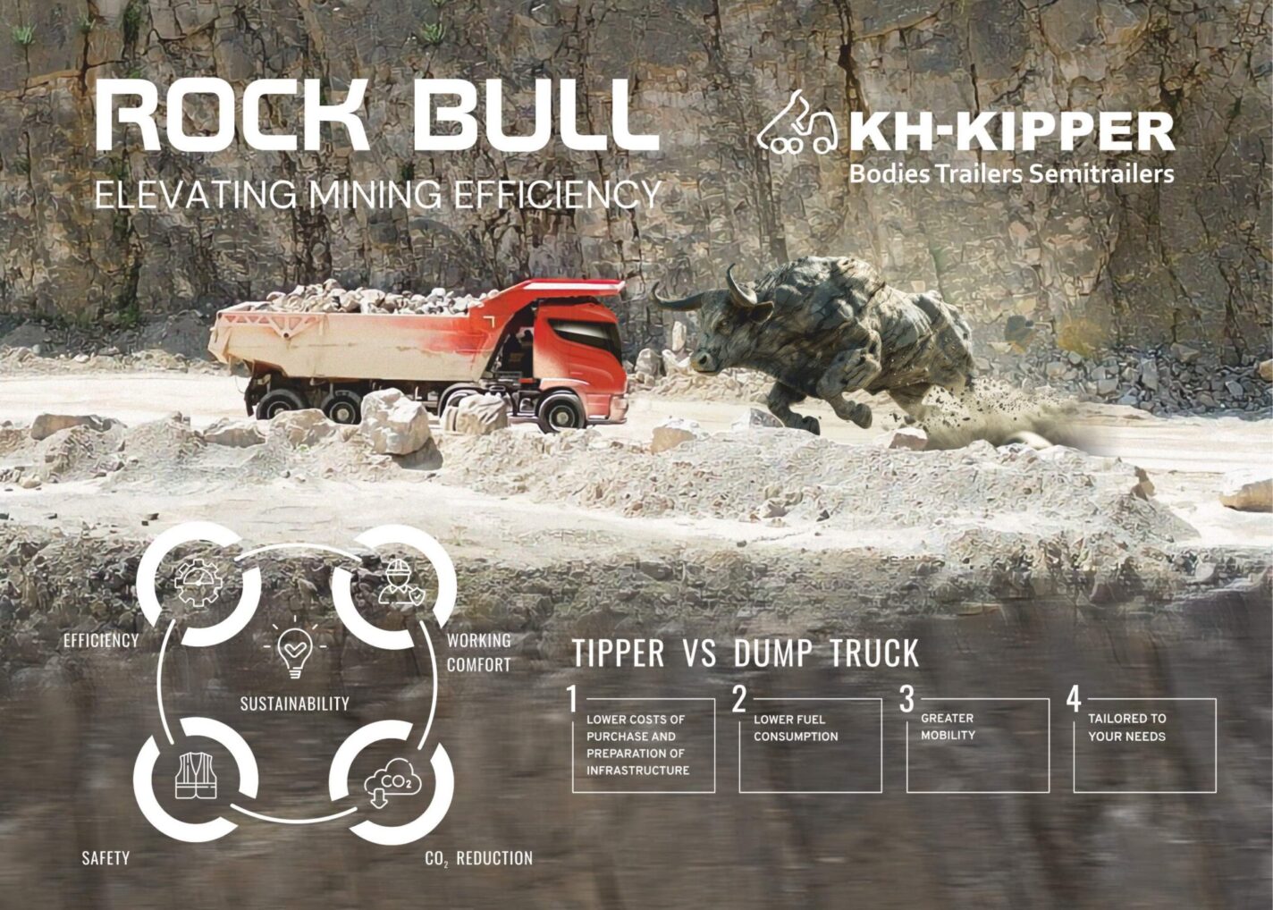 W1RB Rock Bull to nowa zabudowa wywrotki dla transportu urobku górniczego. To wysokowydajny sprzęt, który pozwala na sprawny załadunek łyżką o dowolnej objętości, bezpieczny rozładunek w trudnym i grząskim terenie, a także bezproblemowe poruszanie się po ograniczonych przestrzeniach, w tym ciasnych zakrętach dróg technologicznych.