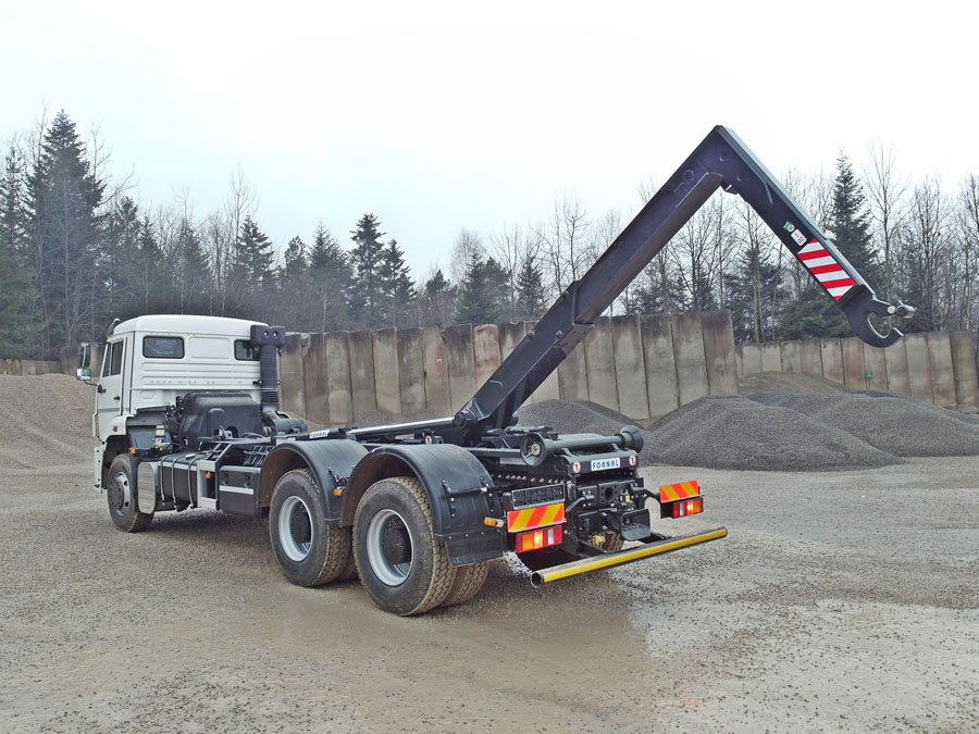Burta hydrauliczna opuszcza się płynnie w dół od pozycji pionowej do 180°. Umożliwia to podjechanie wózkiem widłowym pod samą zabudowę i sprawny załadunek materiałów spaletyzowanych. Szerokość wewnętrzna skrzyni wynosi 2 410 mm. Wyjątkowe rozwiązanie pozwala na załadownie dwóch palet obok siebie.